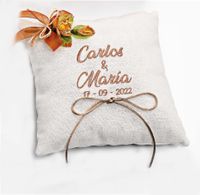 Ref. 7117 Cojín porta alianzas ocre con bordado personalizado 19 x 19 cm. PVP. 24,86 €
