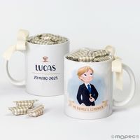 Ref. GD763 Taza niño comunión rubio con 7 caramelos grabada PVP. 13,36 € (mínimo pedido grabado 3u.)